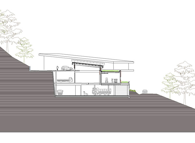 La toiture s’organisera, pour sa majeure partie, en plaque translucides habillées de lames de bois formant porte-neige. Certaines zones semi enterrées, seront végétalisées.