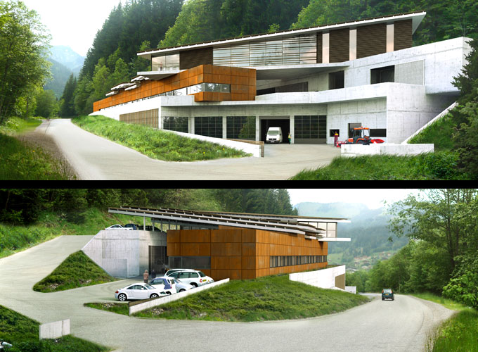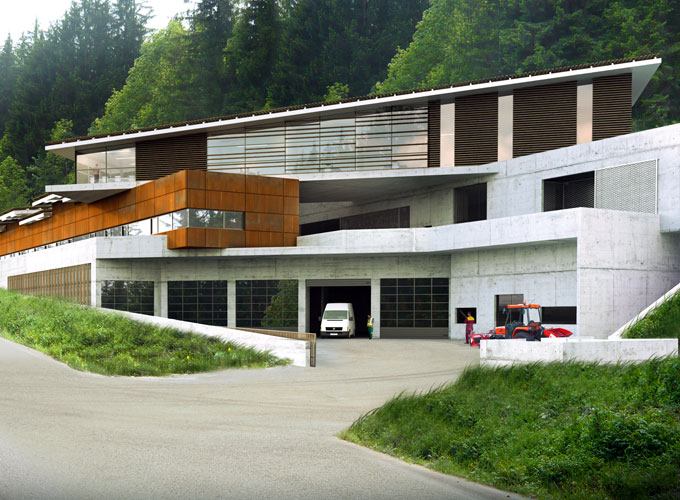 Le bâtiment répond à trois fonctions - garage, entrepôt et services généraux- clairement identifiées par une volumétrie et des matériaux distincts. Un béton robuste et peu sensible aux agressions du temps pour le garage formant soubassement. L’acier CORTEN façonné gage d’efficacité et d'image noble et pérenne pour l'entrepôt. Le verre autorisant de larges vues et le bois matérialisant le paysage lointain pour les services généraux.