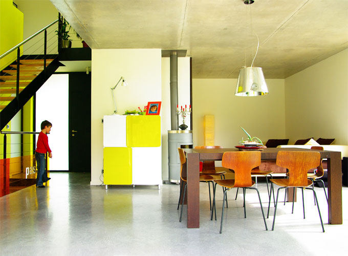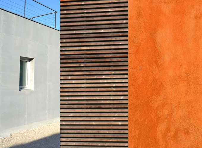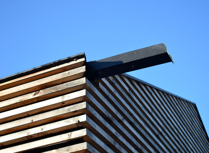 Dans un souci de développement durable, les matériaux retenus demandent peu d’entretien et sont de préférence utilisés bruts afin de mettre en valeur leur texture naturelle. Le métal de la structure et des gardes corps est galvanisé. Les essences choisies pour le bois sont naturellement durables : mélèze pour les menuiseries et douglas ou robinier pour le bardage. L’absence d’avant toit permet un vieillissement homogène du bardage en façades Sud et Ouest. En revêtement de toiture, le zinc a été remplacé par de la tuile plate noire en conformité avec les dispositions de l’article UC 11 du PLU.