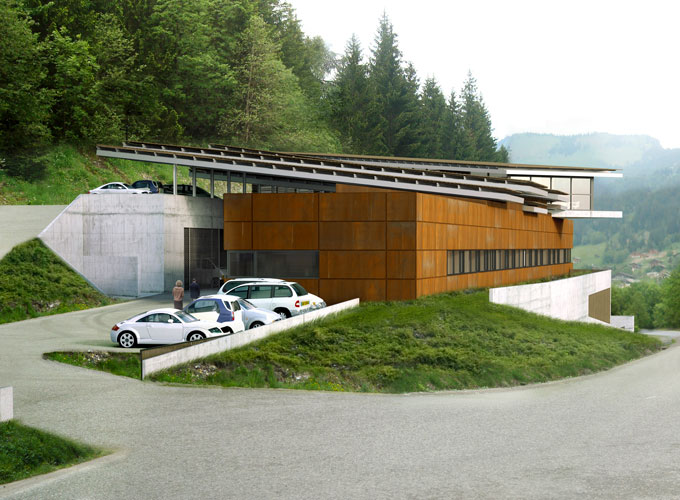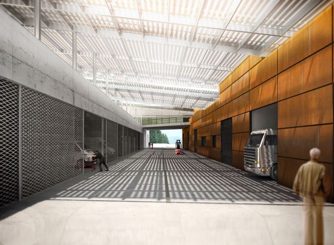 Le bâtiment répond à trois fonctions - garage, entrepôt et services généraux- clairement identifiées par une volumétrie et des matériaux distincts. Un béton robuste et peu sensible aux agressions du temps pour le garage formant soubassement. L’acier CORTEN façonné gage d’efficacité et d'image noble et pérenne pour l'entrepôt. Le verre autorisant de larges vues et le bois matérialisant le paysage lointain pour les services généraux.