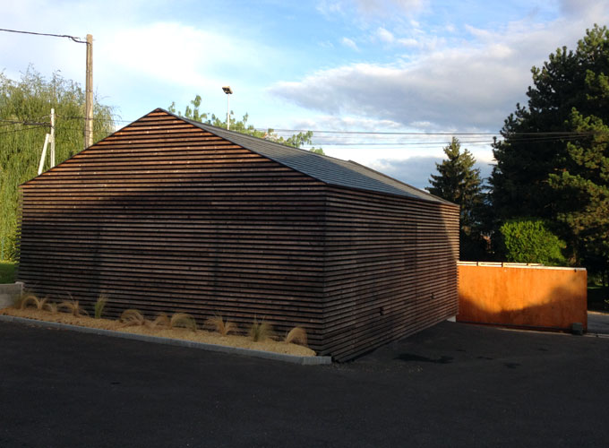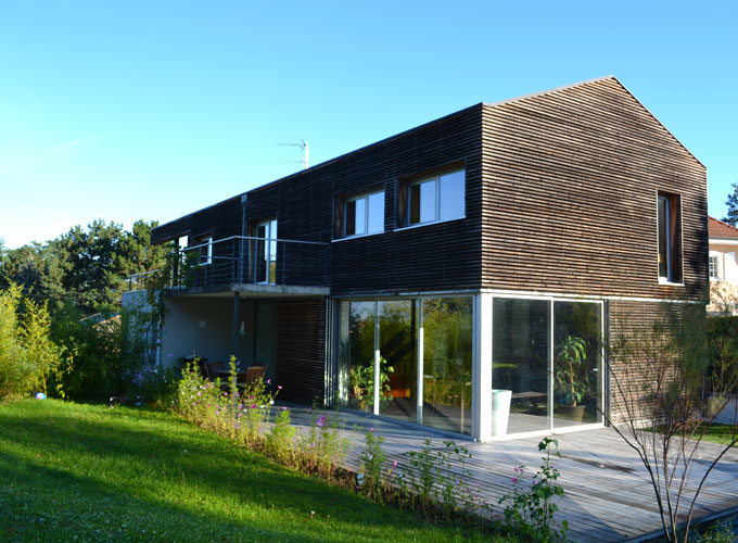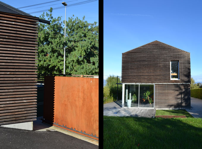 Dans un souci de développement durable, les matériaux retenus demandent peu d’entretien et sont de préférence utilisés bruts afin de mettre en valeur leur texture naturelle. Le métal de la structure et des gardes corps est galvanisé. Les essences choisies pour le bois sont naturellement durables : mélèze pour les menuiseries et douglas ou robinier pour le bardage. L’absence d’avant toit permet un vieillissement homogène du bardage en façades Sud et Ouest. En revêtement de toiture, le zinc a été remplacé par de la tuile plate noire en conformité avec les dispositions de l’article UC 11 du PLU.