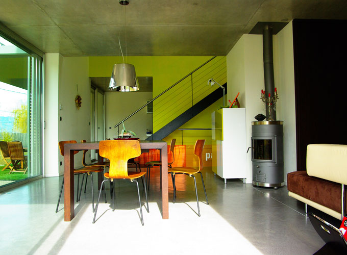 FORME ET FONCTION Le projet est constitué d’une villa regroupant deux logements et un garage. Le tout s’inscrit naturellement dans la longueur du site. Le chemin d’accès se fait par le bas du terrain, il dessert le garage fait de béton et de bardage bois horizontal puis les deux entrées des logements situées à l’arrière du bâtiment sur la façade Est. Juste derrière cette façade en béton, une zone de service d’une largeur de 2 mètres comprenant vestiaires, circulations, toilettes et celliers sert de tampon thermique.