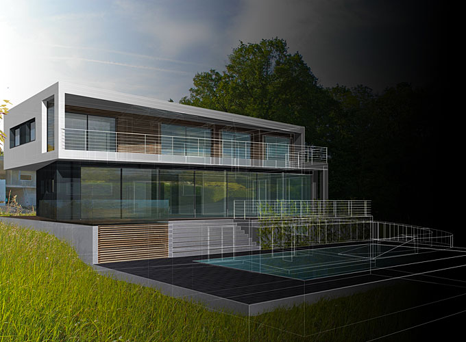 L’architecture se veut discrète. Une grande terrasse située au-dessus du séjour, permet de minimiser l’impact du volume de la villa sur le paysage et favoriser son intégration dans la pente. Cette discrétion sera concrétisée par la mise en place des matériaux suivants : façades en enduit gris clair habillées partiellement en bois et panneaux Natura noir, menuiseries en aluminium de teinte gris anthracite, terrasses boisées avec garde-corps en verre et inox, couverture en tuiles plates de couleur anthracite.